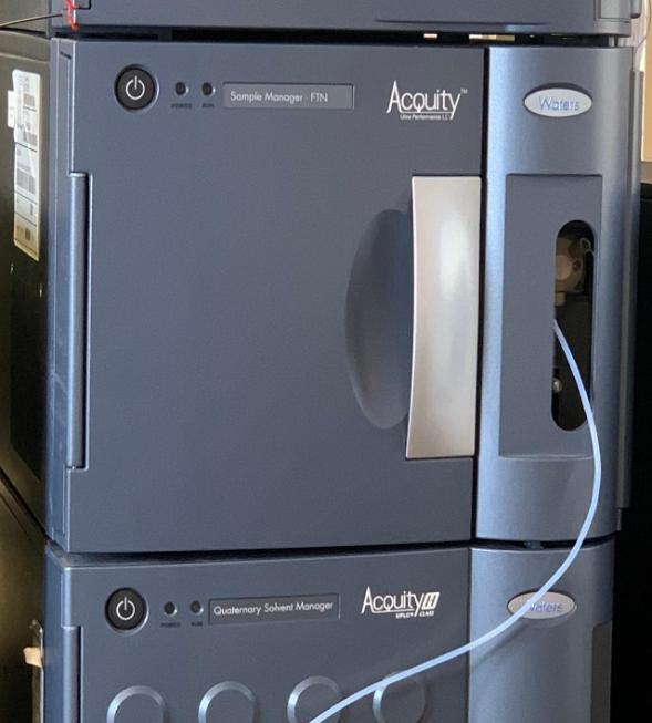 The Waters ACQUITY H-Class is a UPLC equipped with a photodiode array detector (UV), fluorescence detector and QDa mass detector. The QDa is a user friendly mass detector with polarity switching and a mass range of 30-1250 Da.