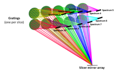 SISA conceptual layout (based on IGIS proposed by the University of Florida by S. Eikenberry and D. Stelter (C. Bourgenot, D. J. Robertson, D. Stelter, S. Eikenberry, Proc. SPIE Vol.9912, 99123M (2016)) using an array of powered slicer mirrors and an array of curved diffraction gratings.